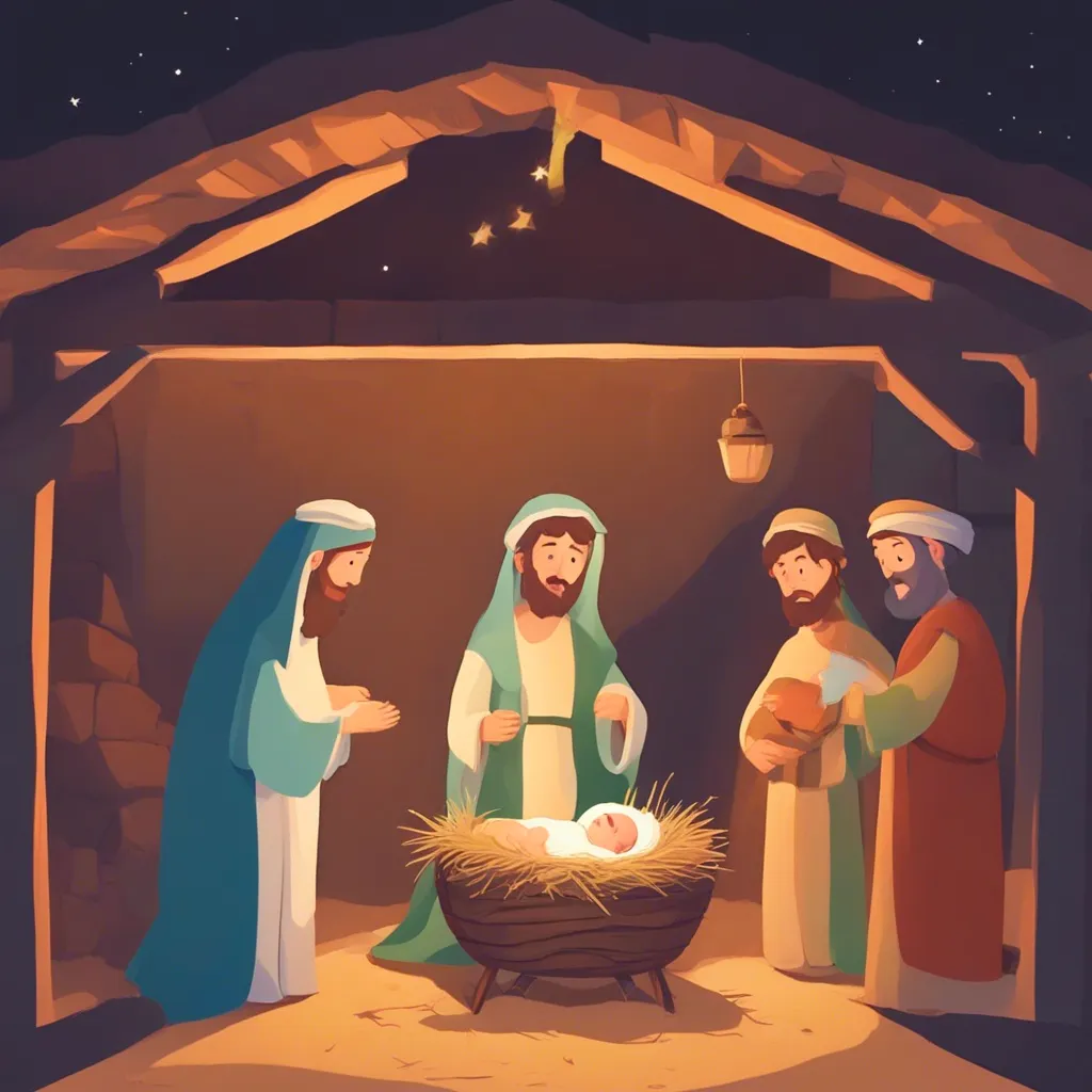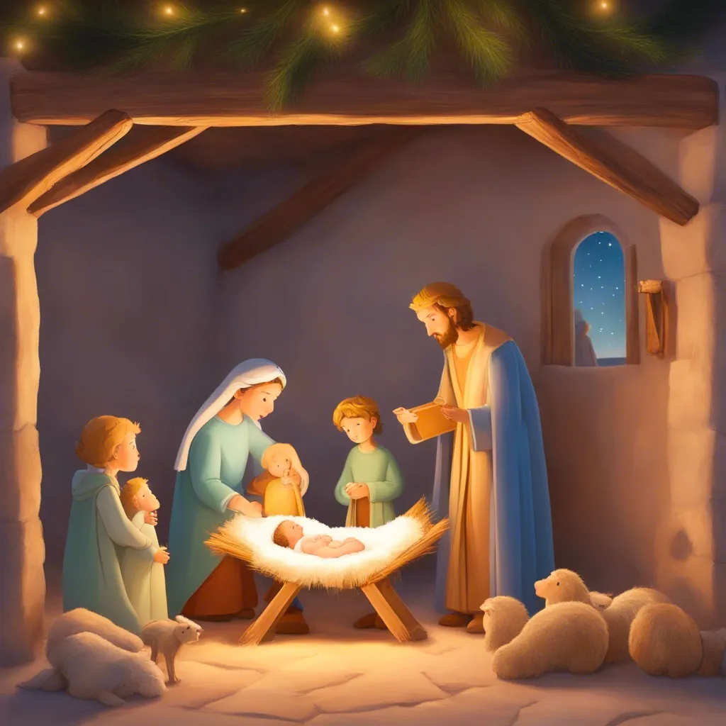【 OO 】는 조심스럽게 마굿간으로 들어갔어요. 그곳에서 본 것은 세상에서 가장 아름다운 장면이었어요. 마굿간 안에는 마리아가 아기를 안고 있었어요. 그 아기는 바로 예수님이었어요. 그리고 그 곁에는 요셉이 있었어요. 요셉은 마리아와 아기 예수님을 사랑의 눈길로 바라보고 있었어요.