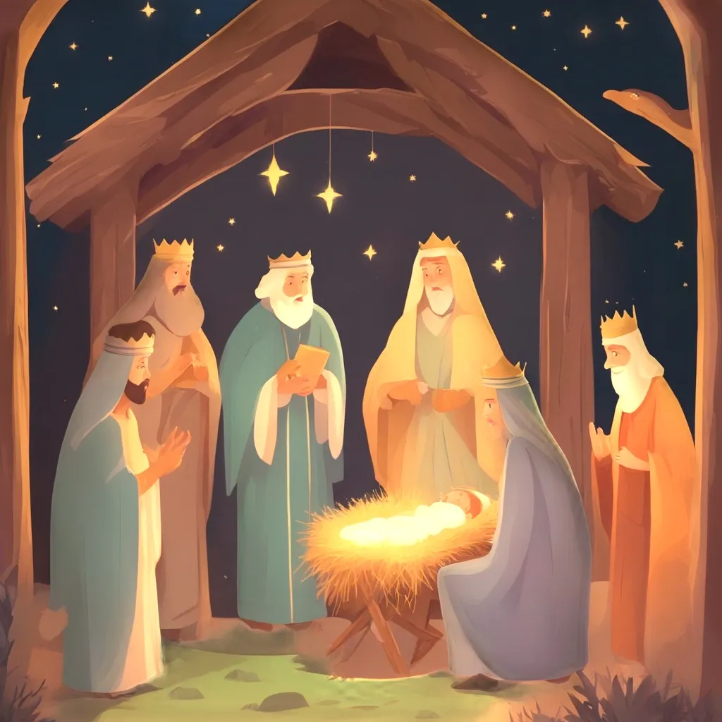 그리고 그곳에는 동방에서 온 박사들도 있었어요. 그들은 멀리서 밝은 별을 따라 이곳까지 온 사람들이었어요. 그들은 예수님께 공경하며, 각자 가져온 선물을 바치고 있었어요.