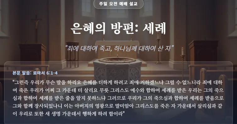 사랑하는 성도 여러분, 지난주 우리는 하나님의 말씀이 어떻게 우리를 구원하는 은혜의 방편이 되는지 나누었습니다. 오늘은 하나님께서 우리에게 주신 또 다른 은혜의 통로, 바로 '성례(Sacraments)'에 대해 말씀을 나누고자 합니다.