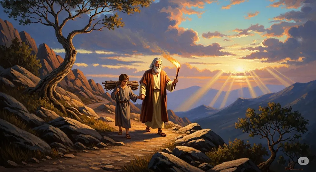 아브라함이 이에 번제 나무를 가져다가 그의 아들 이삭에게 지우고 자기는 불과 칼을 손에 들고 두 사람이 동행하더니
