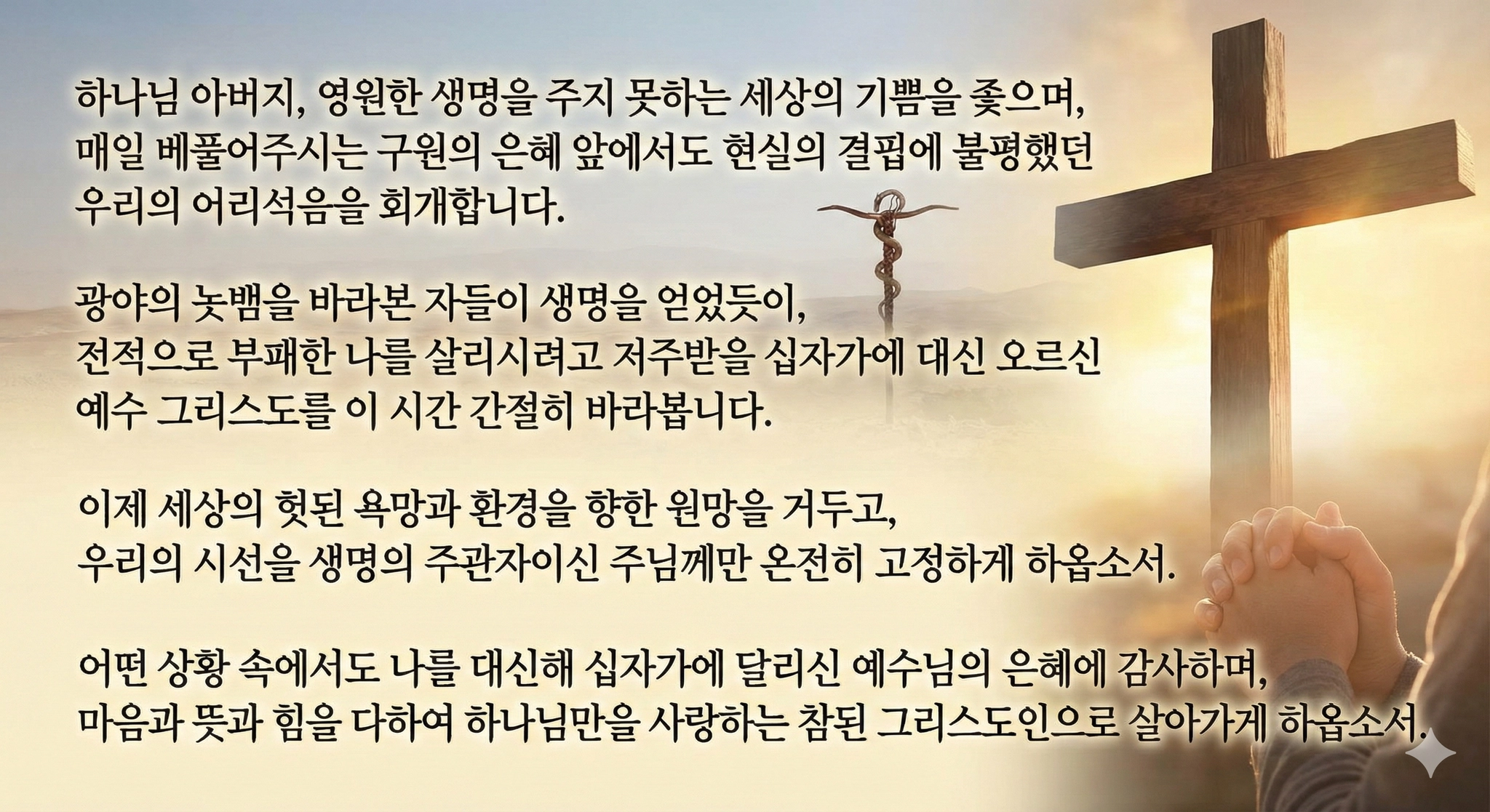 은혜를 잊고 불평하는 백성들을 향해 하나님께서는 불뱀을 보내어 심판하셨지만, 모세에게 놋뱀을 만들어 장대 위에 달게 하심으로 다시 살 길을 열어주셨습니다. 놋뱀을 쳐다보는 자는 모두 살 것이라는 이 처방은, 하나님께서 우리에게 원하시는 것이 스스로의 인간적인 ‘노력’이나 ‘실행’이 아님을 보여줍니다. 하나님께서는 그저 죽음과 결핍을 향해 있던 원망의 눈을 돌려, 오직 구원자이신 하나님만을 온전히 바라보는 ‘사랑의 회복’을 명령하신 것입니다.